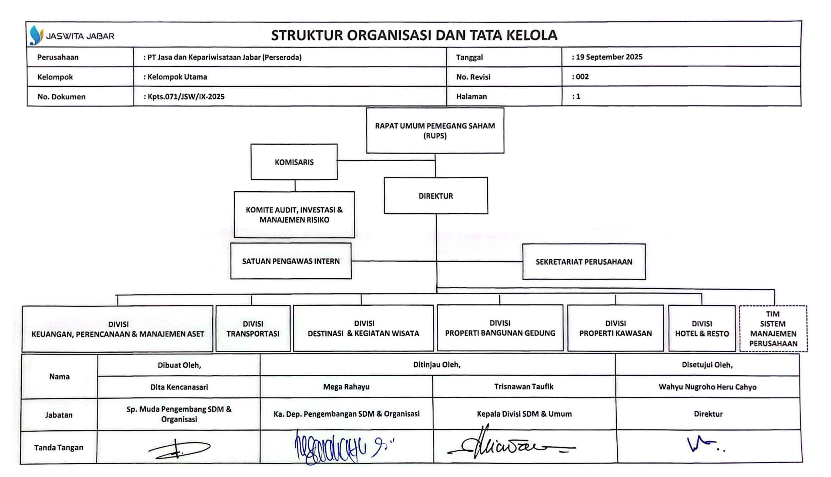 Berikut ini adalah struktur organisasi PT Jasa dan Kepariwisataan Jabar: